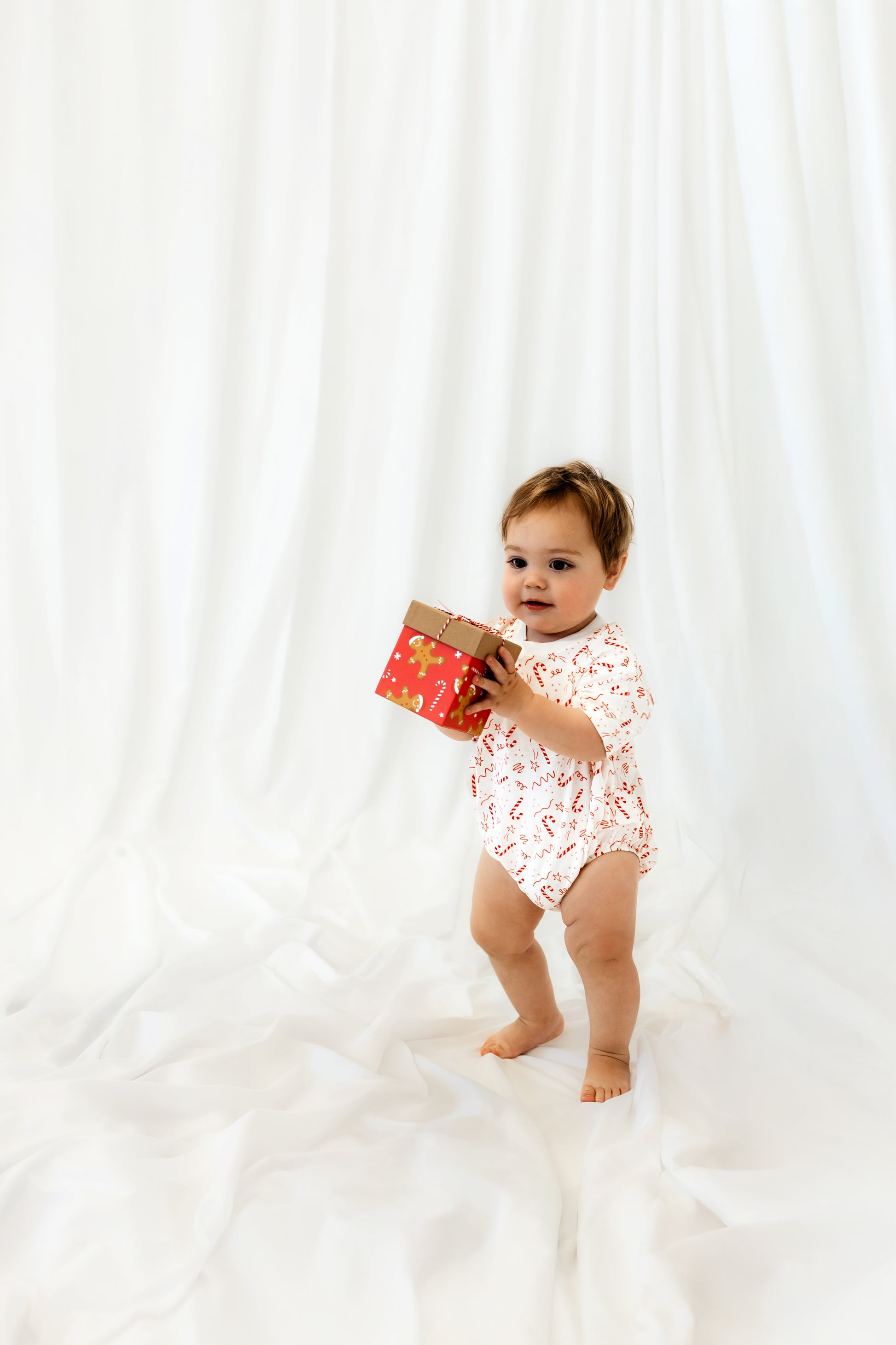 Get your little one ready to jingle all the way in our sweet Candy Cane Lane romper! Featuring a festive red and white candy cane print and made using soft, buttery fabric, it’s perfect for cozy cuddles or everyday wear. This oversized romper pairs perfectly with our matching family Christmas Collection so everyone can celebrate in cheerful style!